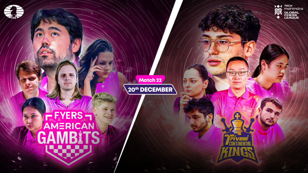 FYERS American Gambits 7-8 Triveni Continental Kings GM Nakamura, Hikaru 1-1 GM Firouzja, Alireza GM Artemiev, Vladislav 1-1 GM Wei, Yi GM Rapport, Richard 1-1 GM Vidit, Santosh Gujrathi GM Assaubayeva, Bibisara 1-1 GM Zhu, Jiner IM Injac, Teodora 3-0 GM Kosteniuk, Alexandra GM Murzin, Volodar 0-4 GM Maurizzi, Marc’Andria The Triveni Continental Kings squeezed […]